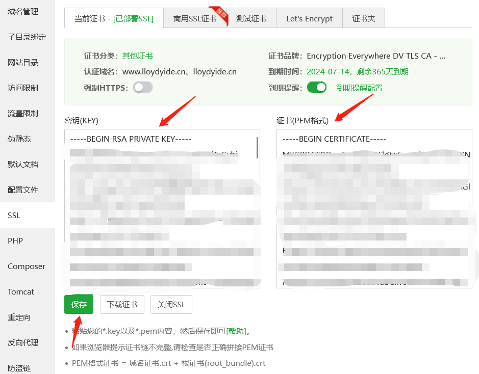 第三步:进入到宝塔面板SSL证书的栏目,部署SSL证书
