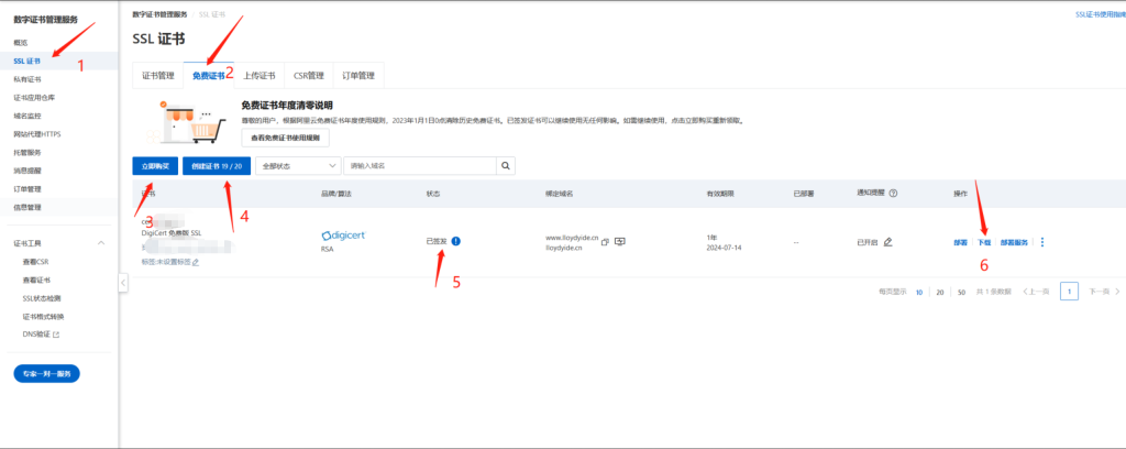 有段时间没来关注网站,导致SSl证书过期。根据以往的经验直接在宝塔面板申请续签即可,但是这次的续签一直报错,超过了五次还需要等待一个小时。SSL续签的效率变得很低,我的SSL证书是Let's Encrypt签发的,根据我从网上的了解,有可能是面板需要更新,证书保存位置更改的原因。但因为之前试错导致需要大量时间等待,我又偶然了解到可以从国内的阿里云或腾讯云来申请SSL,于是我打算换一家申请,再自己部署。一下是使用阿里云申请免费SSL证书和部署到宝塔面板的过程。